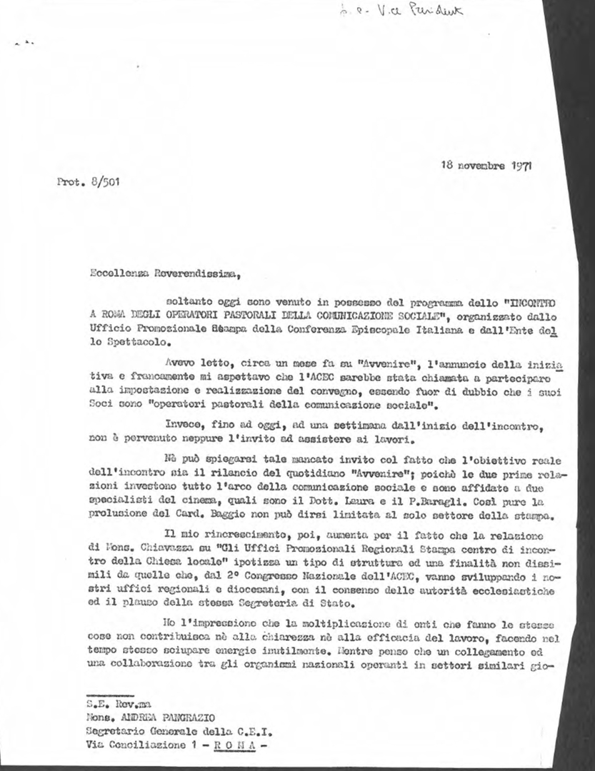Mons. Luigi Pignatiello, delegato diocesano e regionale dell'ACEC (Associazione cattolica esercenti cinema) e poi vice-presidente e presidente nazionale della stessa associazione, scrive ad Andrea Pangrazio, segretario generale della CEI, esprimendo rincrescimento per il mancato invito all'Incontro a Roma degli operatori pastorali della comunicazione sociale. Dattiloscritto