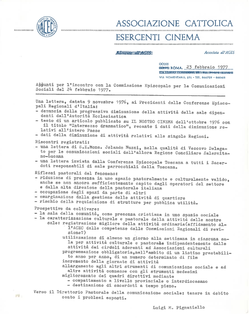 "Appunti per l'incontro con la Commissione Episcopale per le Comunicazioni Sociali del 24 febbraio 1977", a cura di mons. Luigi Pignatiello, delegato diocesano e regionale dell'ACEC (Associazione cattolica esercenti cinema) e poi vice-presidente e presidente nazionale della stessa associazione