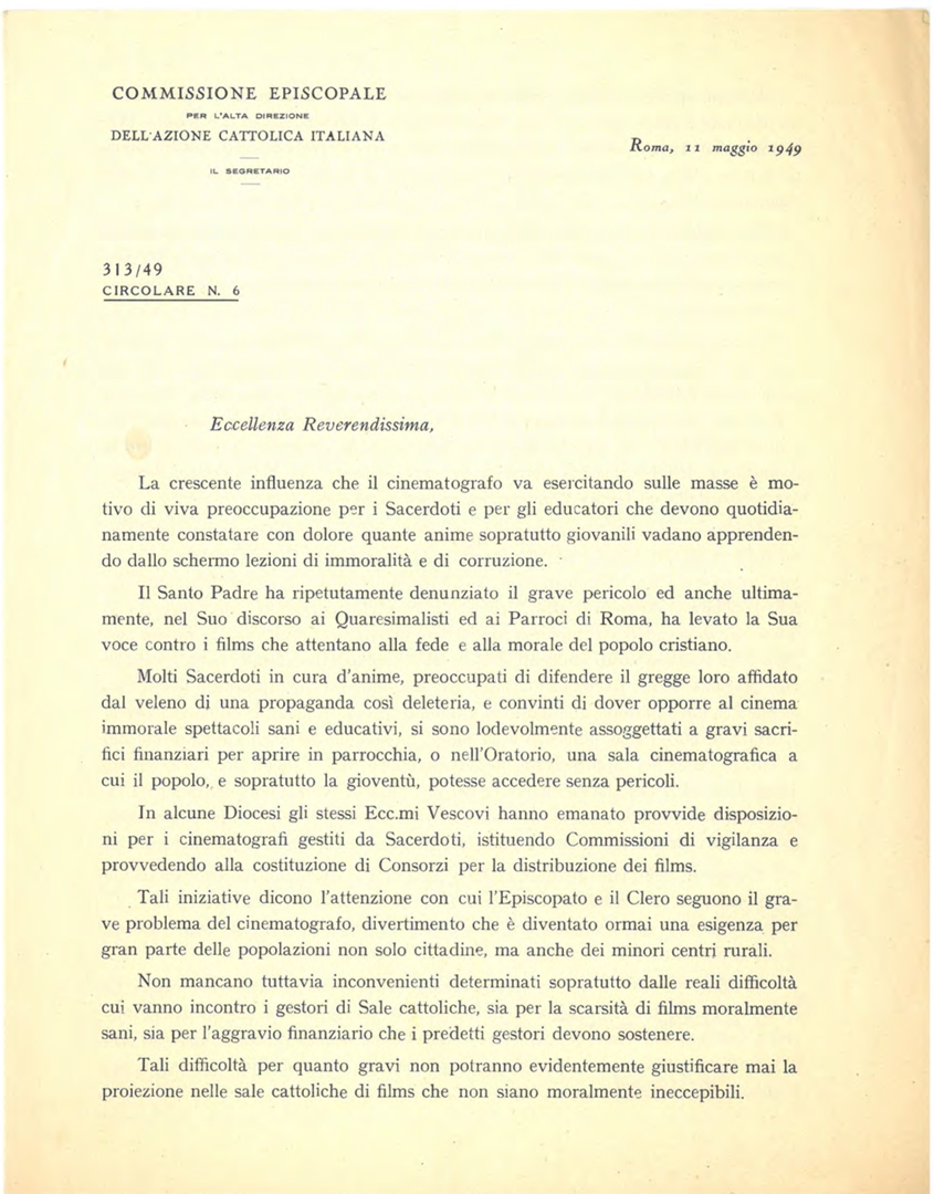 Giovanni Urbani, vescovo di Assume, segretario della Commissione Episcopale per l'A.C.I., Azione Cattolica Italiana, esprime considerazioni sull'importanza della presenza attiva dei cattolici nel campo cinematografico e sull'attività delle sale parrocchiali. Dattiloscritto