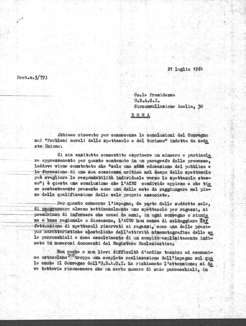 Lettera di mons. Francesco Della Zuanna in merito alla posizione dell'Unione Donne di Azione Cattolica Italiana - UDACI, sull'attività cinematografica cattolica