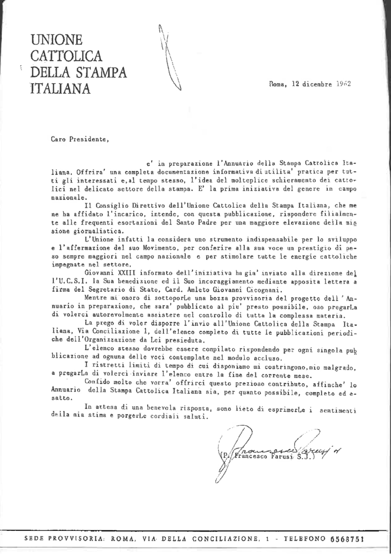 Francesco Farusi trasmette a mons. Francesco Dalla Zuanna, presidente dell'A.C.E.C., la scaletta dell'Annuario della Stampa cattolica italiana, con considerazioni sull'azione delle forze cattoliche impegnate nel settore della stampa. Elenco dattiloscritto e lettera di trasmissione