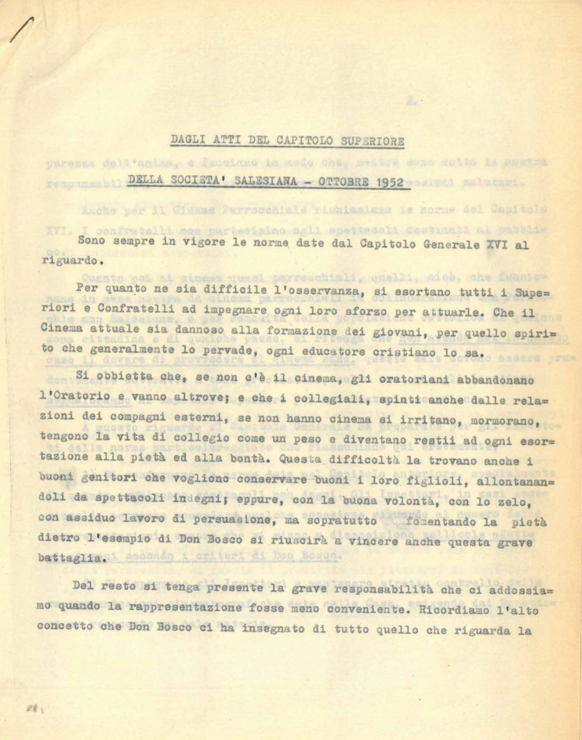Posizione dei salesiani sul cinema e sulla sua funzione pedagogica, e considerazioni circa l'attività delle sale parrocchiali. Testo dattiloscritto