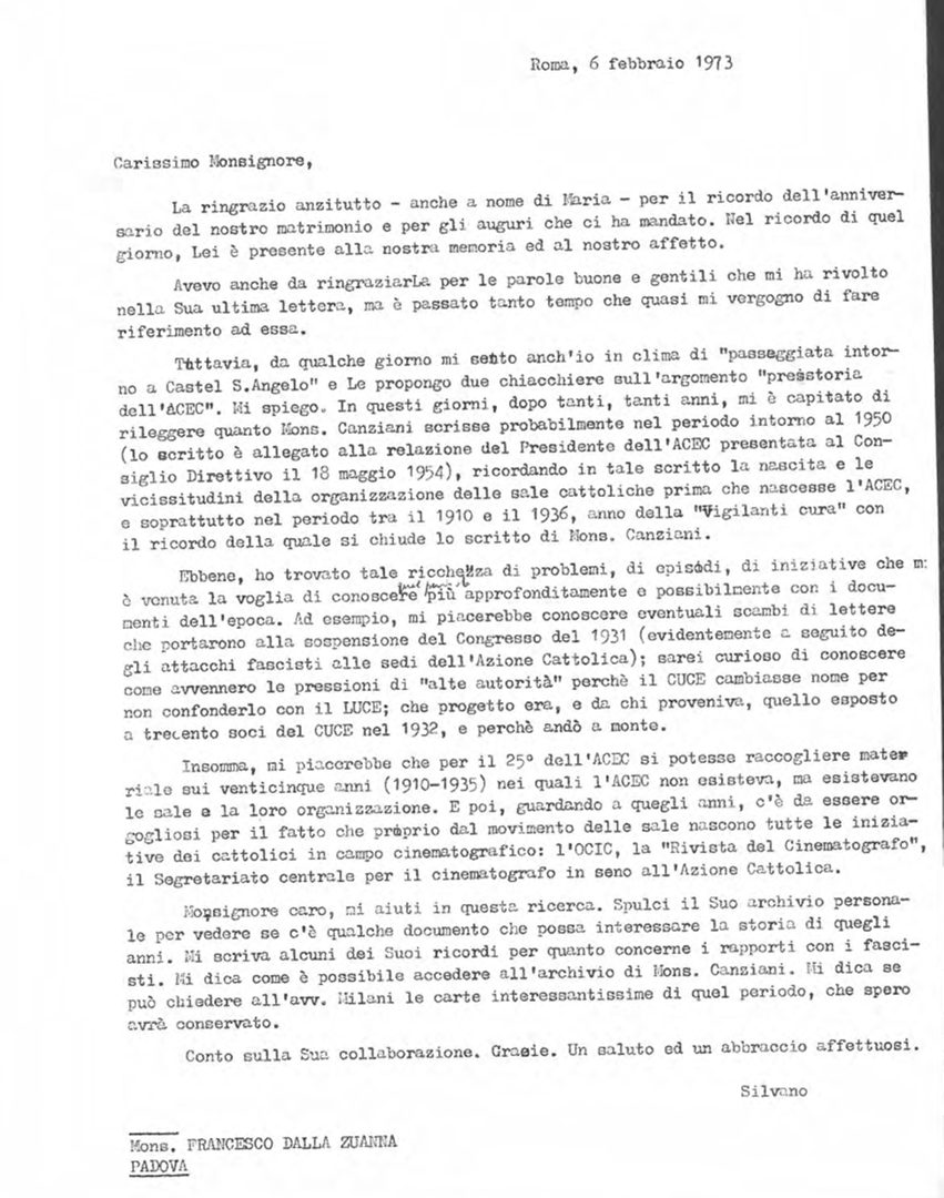 Silvano Battisti scrive a Francesco Dalla Zuanna in merito alla ricerca di documentazione sul tema dell'organizzazione delle sale cattoliche prima della nascita dell'ACEC (periodo 1910-1935). Dattiloscritto