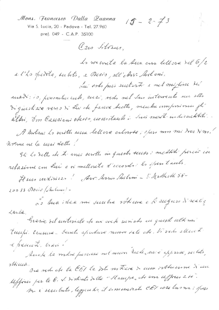 Lettera di mons. Francesco Dalla Zuanna, presidente dell'ACEC, a Silvano Battisti, segretario generale dell'ACEC