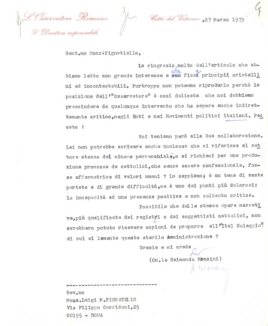 Lettera di Raimondo Manzini, direttore de L'Osservatore romano, a mons. Luigi Pignatiello, delegato diocesano e regionale dell'ACEC