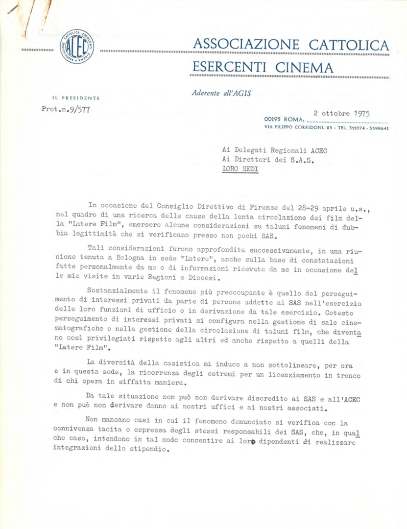 Luigi Pignatiello scrive ai delegati regionali ACEC e ai direttori dei Servizi assistenza sale - SAS in merito a fatti riconducibili a interessi privati nella gestione delle sale cinematografiche e della circolazione dei film. Dattiloscritto