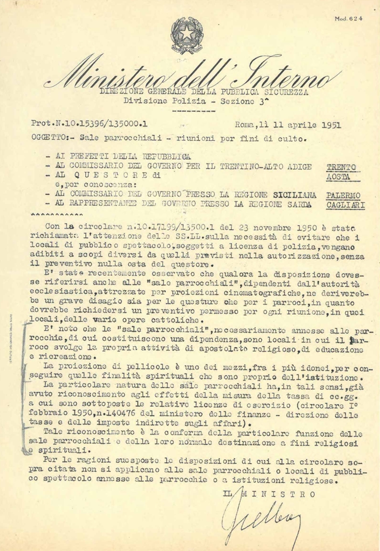 Circolare del Ministero dell'Interno. Direzione della Pubblica sicurezza alle amministrazioni di Trento, Palermo, Aosta, Cagliari