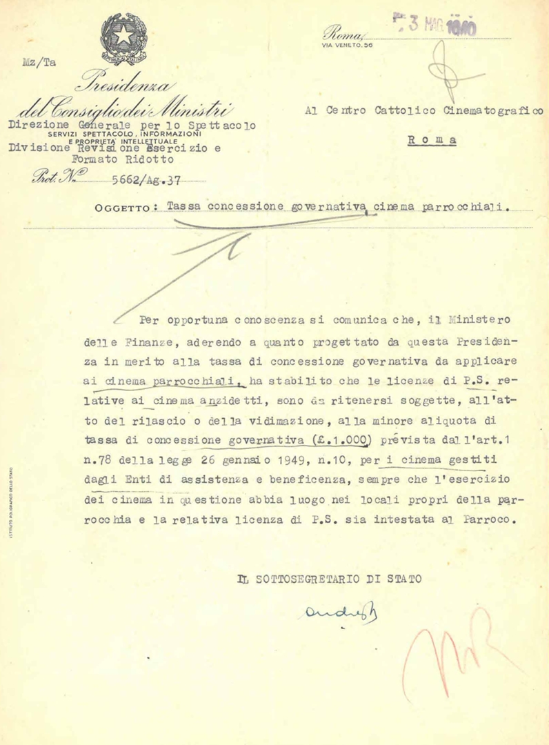 Giulio Andreotti scrive al Centro cattolico cinematografico - CCC in merito alla tassa di concessione governativa da applicare ai cinema parrocchiali. Dattiloscritto