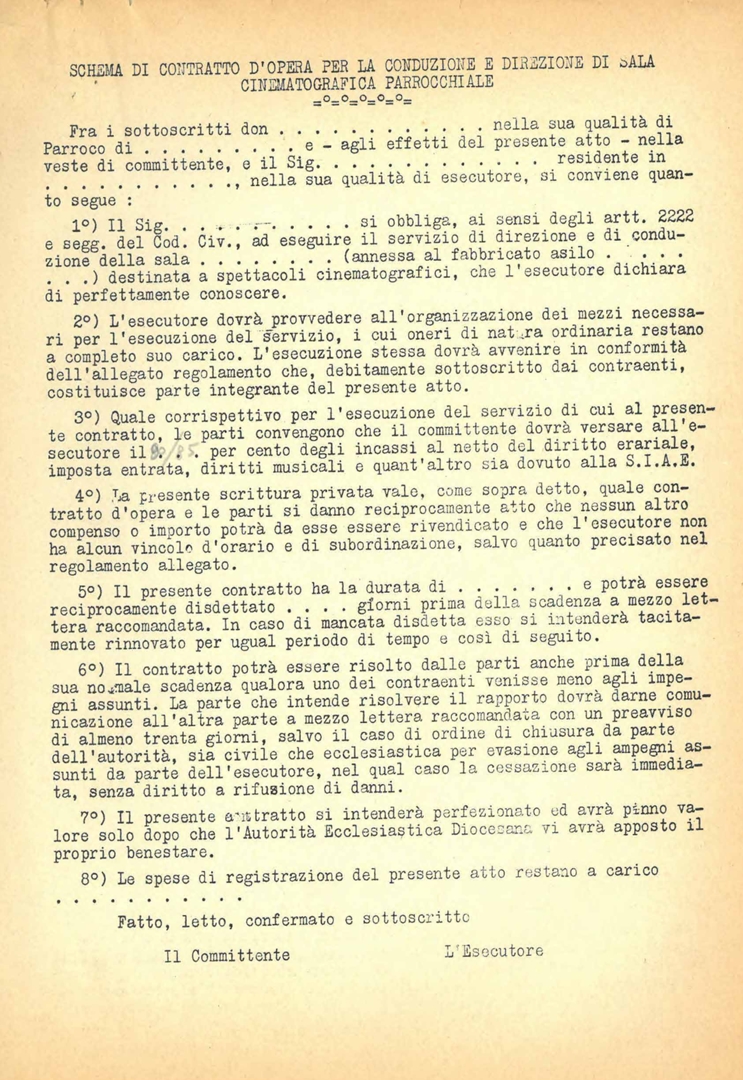 "Schema di contratto d'opera per la conduzione e direzione di sala cinematografica parrocchiale"