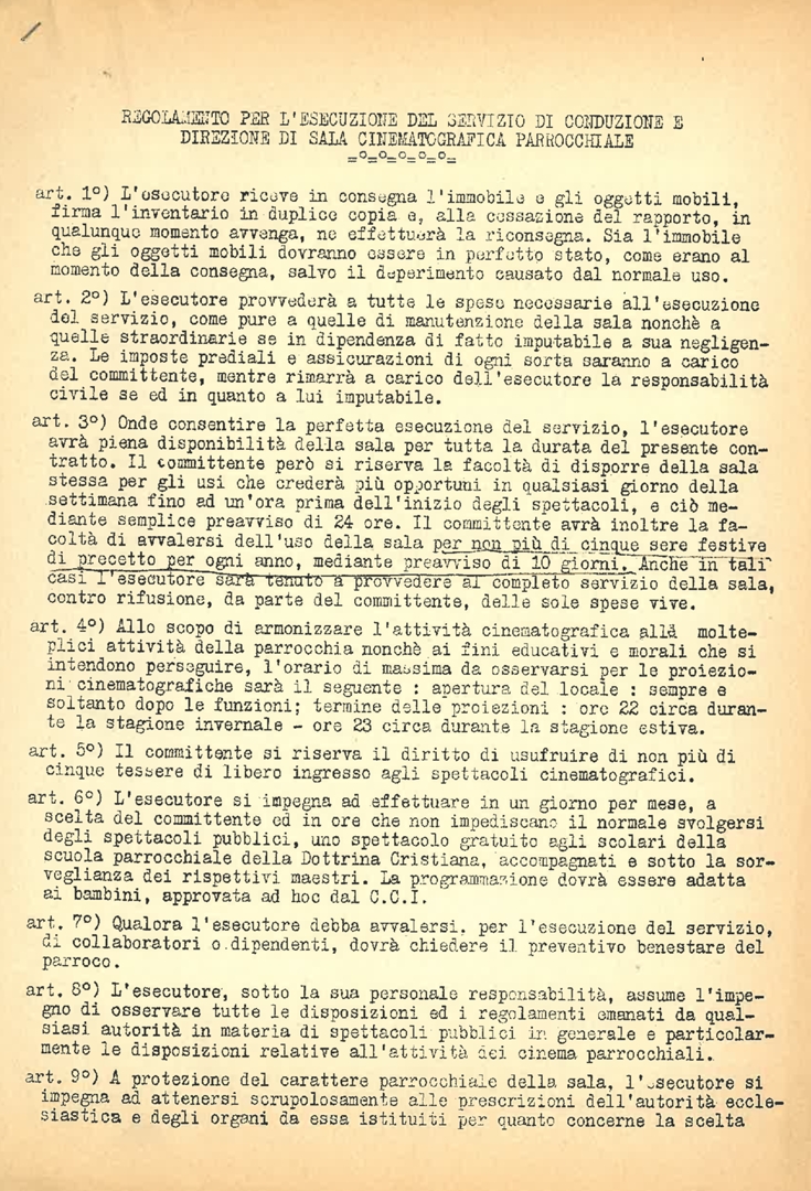 "Regolamento per l'esecuzione del servizio di conduzione e direzione di sala cinematografica parrocchiale"
