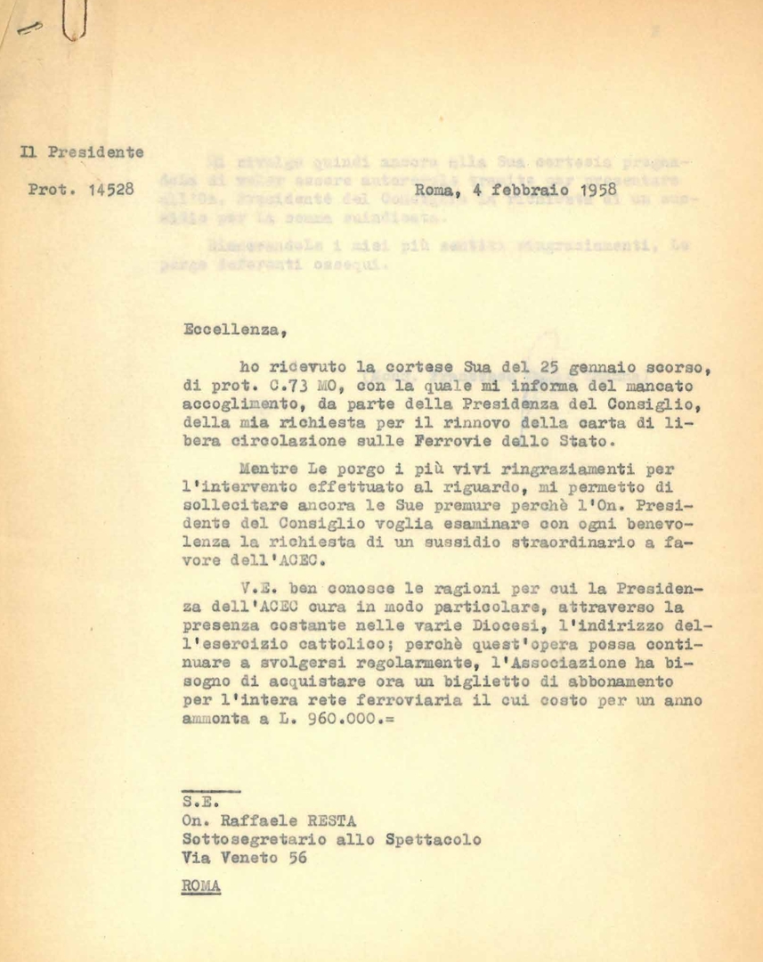 Due lettere di mons. Francesco Dalla Zuanna, presidente dell'ACEC: una all'on. Raffaele Resta, sottosegretario allo spettacolo, l'altra all'on. Lorenzo Spallino, sottosegretario di Stato alla presidenza del consiglio dei ministri