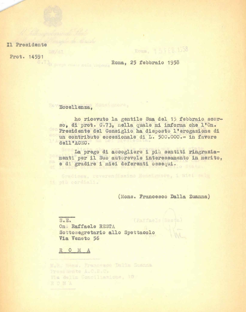 Due lettere di mons. Francesco Dalla Zuanna, presidente dell'ACEC: una all'on. Raffaele Resta, sottosegretario allo spettacolo, l'altra all'on. Lorenzo Spallino, sottosegretario di Stato alla presidenza del consiglio dei ministri