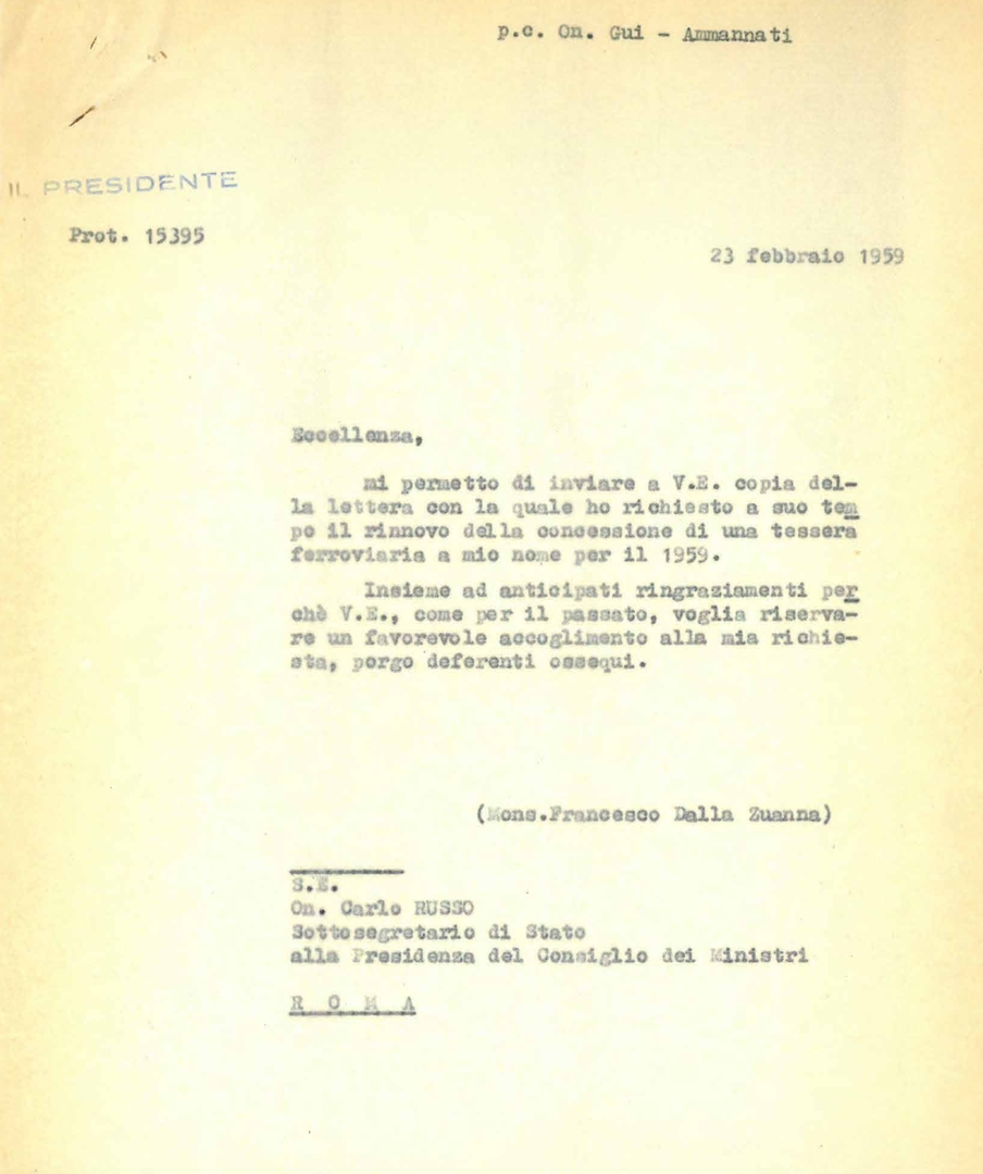 Francesco Dalla Zuanna si rivolge a Carlo Russo, Lugi Gui e Floris Luigi Ammannati per ottenere il rinnovo della carta di libera circolazione sulle ferrovie dello Stato a favore dei dirigenti dell'ACEC. Dattiloscritto