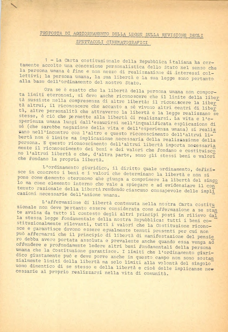 Considerazioni in merito alla legge sulla revisione degli spettacoli cinematografici. Dattiloscritto non firmato