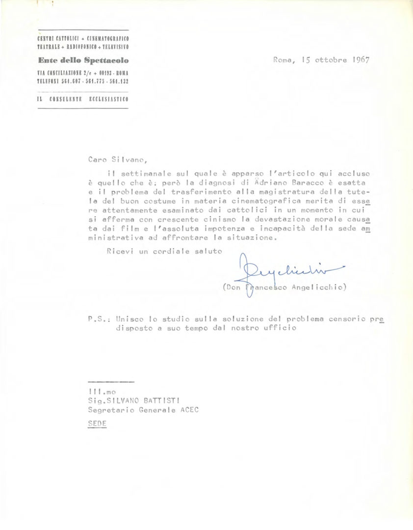 Lettera di Francesco Angelicchio, direttore dell'Ufficio nazionale dello spettacolo della Commissione della conferenza episcopale Italiana per le comunicazioni sociali - CEI, a Silvano Battisti, segretario generale dell'ACEC, sul tema della censura cinematografica