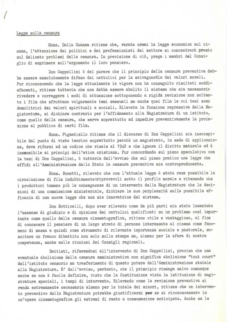 Legge sulla censura: considerazioni di mons. Dalla Zuanna, don Cappellini, mons. Pignatiello, mons. Bonetti, don Botticelli, Battisti, estratte dal verbale del consiglio direttivo dell'ACEC del 10, 11 e 12 gennaio 1966. Dattiloscritto