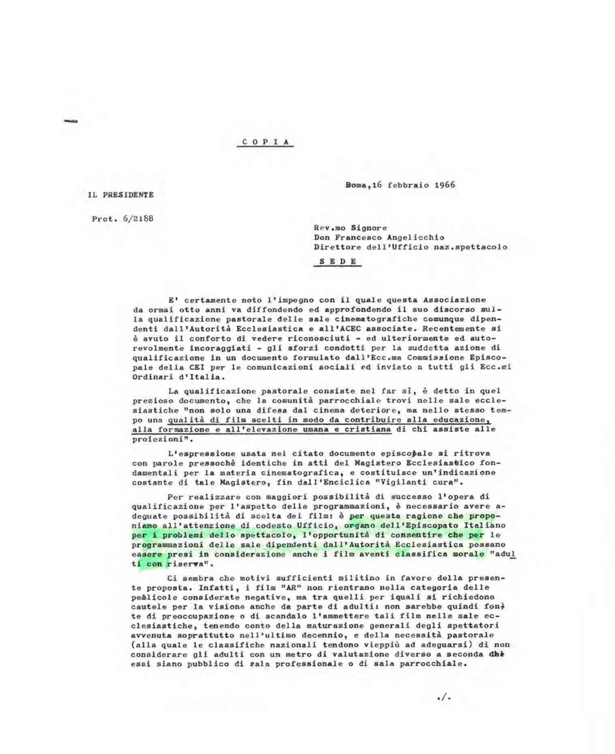 Mons. Dalla Zuanna scrive a don Angelicchio sull'importanza della qualificazione pastorale delle sale cinematografiche e sul valore educativo e formativo dei film selezionati e classificati. Dattiloscritto