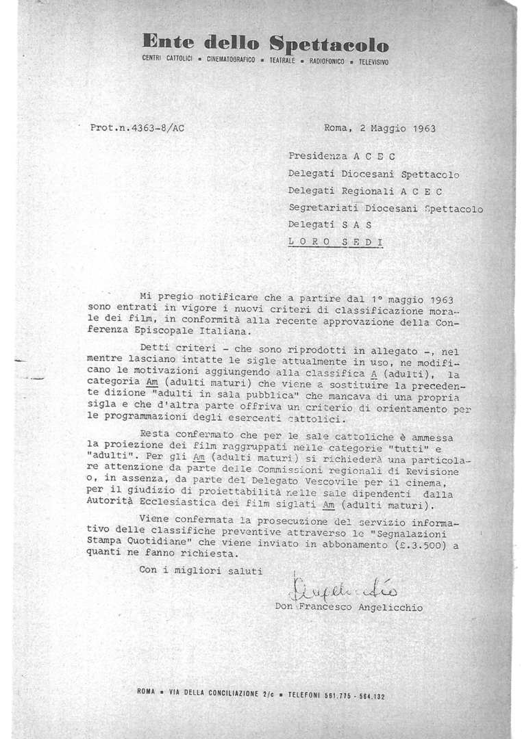 Criteri di classificazione morale dei film approvati dalla Conferenza episcopale italiana - CEI. Con lettera di trasmissione inviata da don Francesco Angelicchio, direttore dell'Ufficio nazionale dello spettacolo, alla presidenza dell'ACEC e ai delegati e segretari diocesani. Dattiloscritto