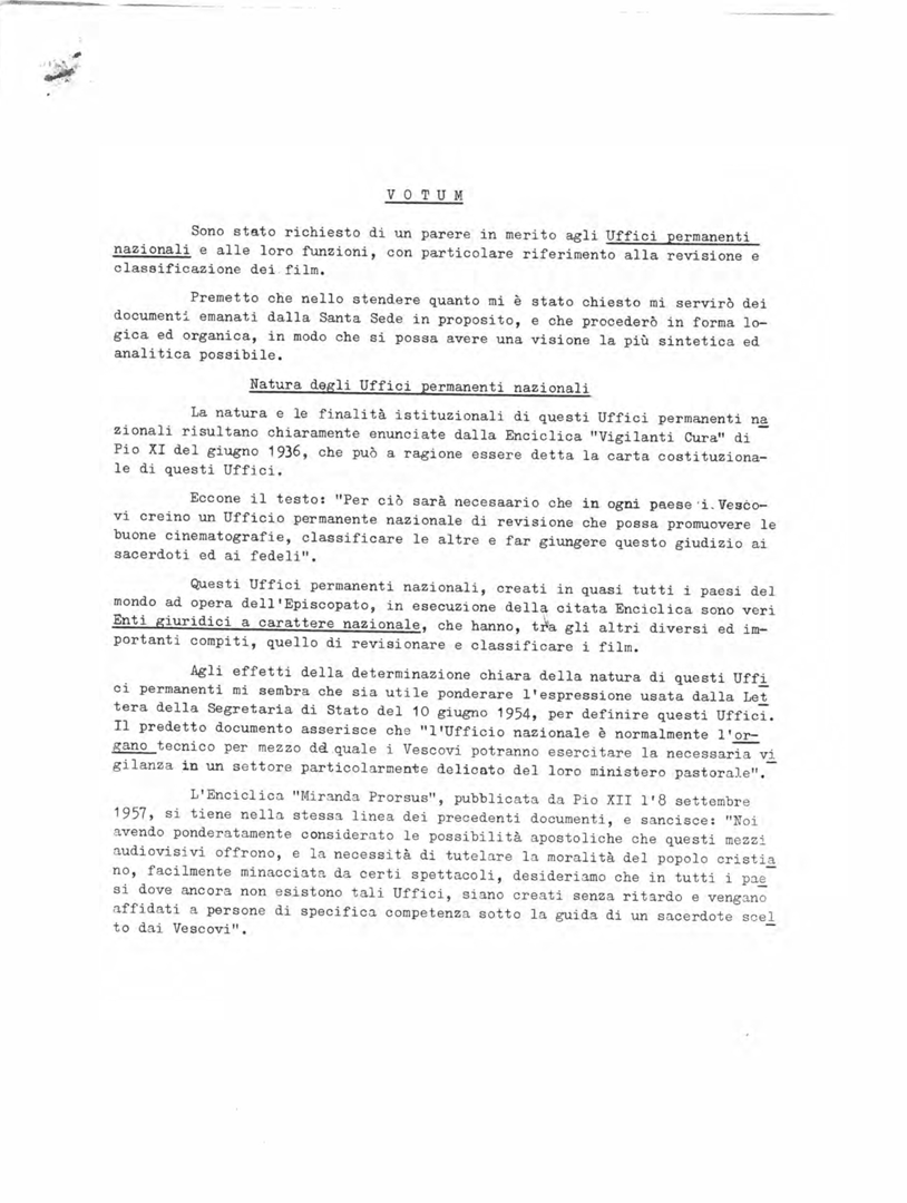 Parere di Salvatore Canals, esperto della pastorale cinematografica, sulla natura e sulle attività degli Uffici permanenti nazionali. Dattiloscritto
