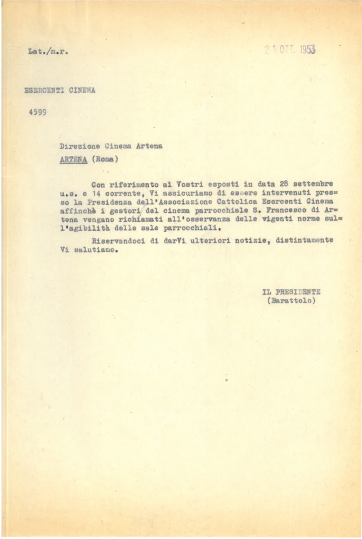 Vincenzo Barattolo scrive in merito all'osservanza delle norme di agibilità delle sale parrocchiali da parte del cinema S. Francesco di Artena. Dattiloscritto