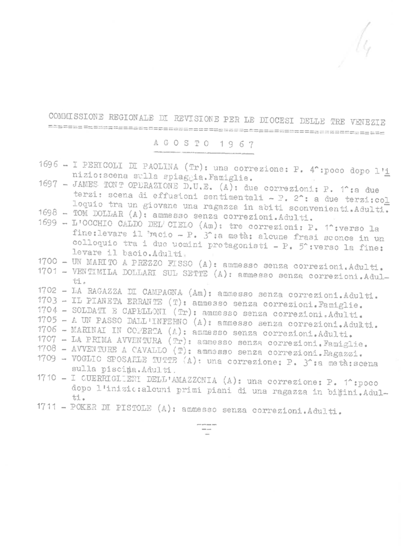 Classificazione di film, a cura della Commissione regionale di revisione per le diocesi delle Tre Venezie
