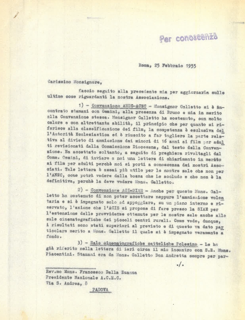 Floris Luigi Ammannati scrive a mons. Francesco Dalla Zuanna per informarlo sulle più recenti questioni relative all'organizzazione e al funzionamento dell'ACEC, in particolare sulle convenzioni e i rapporti con altri enti del settore dello spettacolo e sulla conduzione delle sale cinematografiche parrocchiali. Dattiloscritto