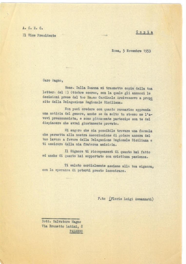 Lettera di Floris Luigi Ammannati, vice presidente dell'ACEC, a Salvatore Magno