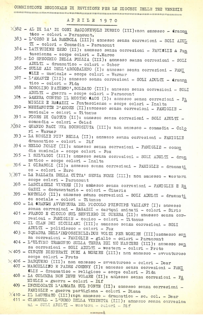 Classificazione di film, a cura della Commissione regionale di revisione per le diocesi delle Tre Venezie