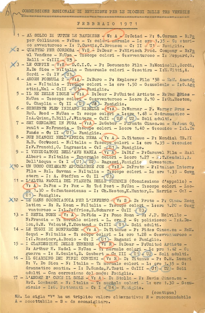Classificazione di film, a cura della Commissione regionale di revisione per le diocesi delle Tre Venezie
