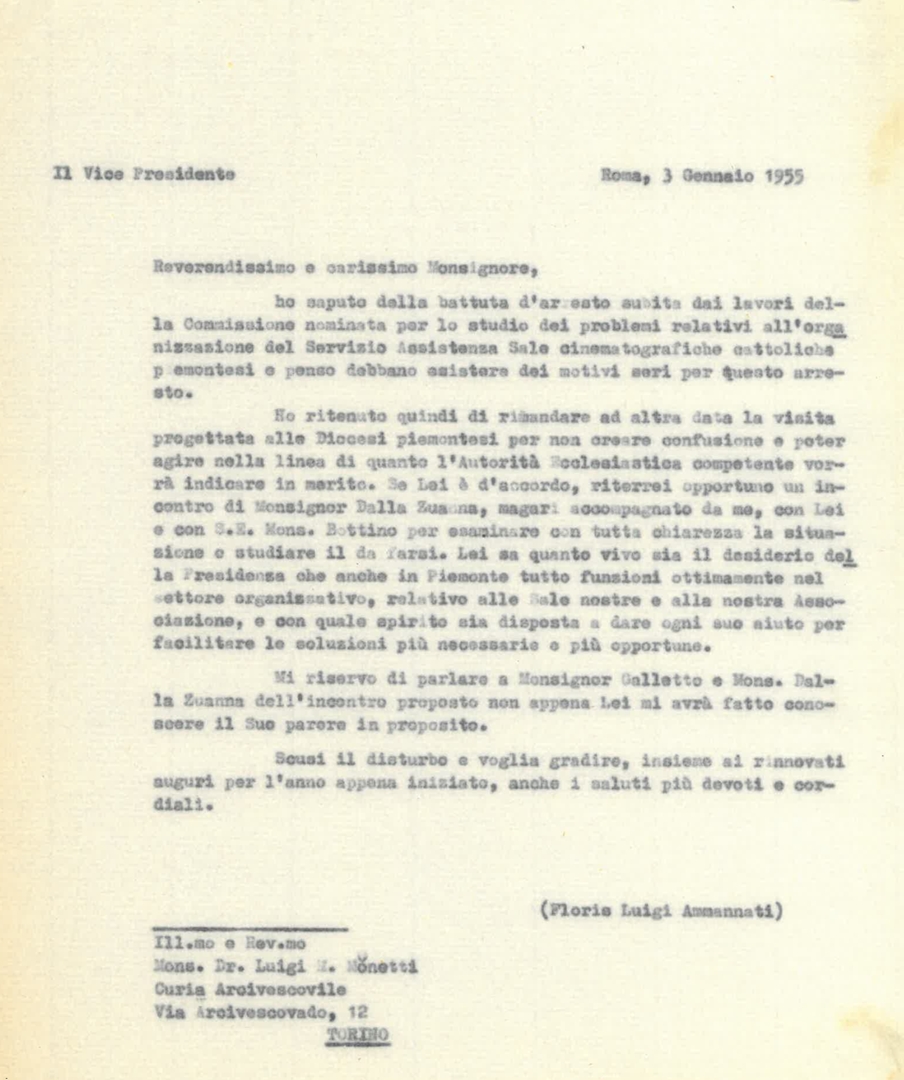Floris Luigi Ammannati scrive a Luigi Monetti in merito al servizio assistenza sale cinematografiche cattoliche piemontesi. Dattiloscritto