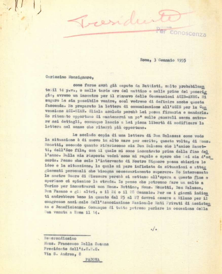 Floris Luigi Ammannati comunica a mons. Francesco Dalla Zuanna aggiornamenti sui rapporti dell'Associazione con gli enti del settore dello spettacolo e sui problemi delle sale cinematografiche parrocchiali in diverse sedi regionali italiane. Dattiloscritto