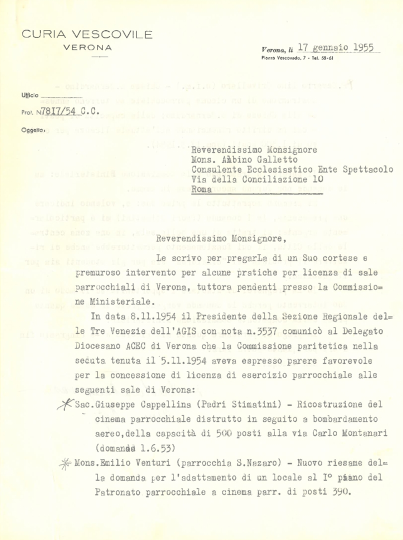 Andrea Pangrazio scrive ad Albino Galletto in merito ad alcune pratiche di licenza per le sale cinematografiche parrocchiali di Verona. Dattiloscritto