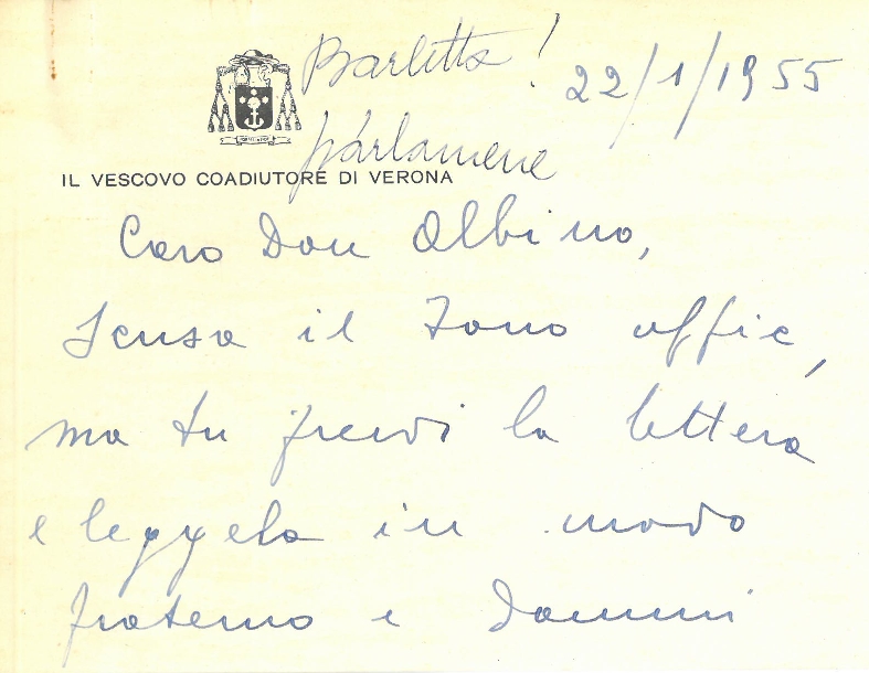 Lettera di Andrea Pangrazio della Curia vescovile di Verona a mons. Albino Galletto, consulente ecclesiastico dell'Ente dello spettacolo
