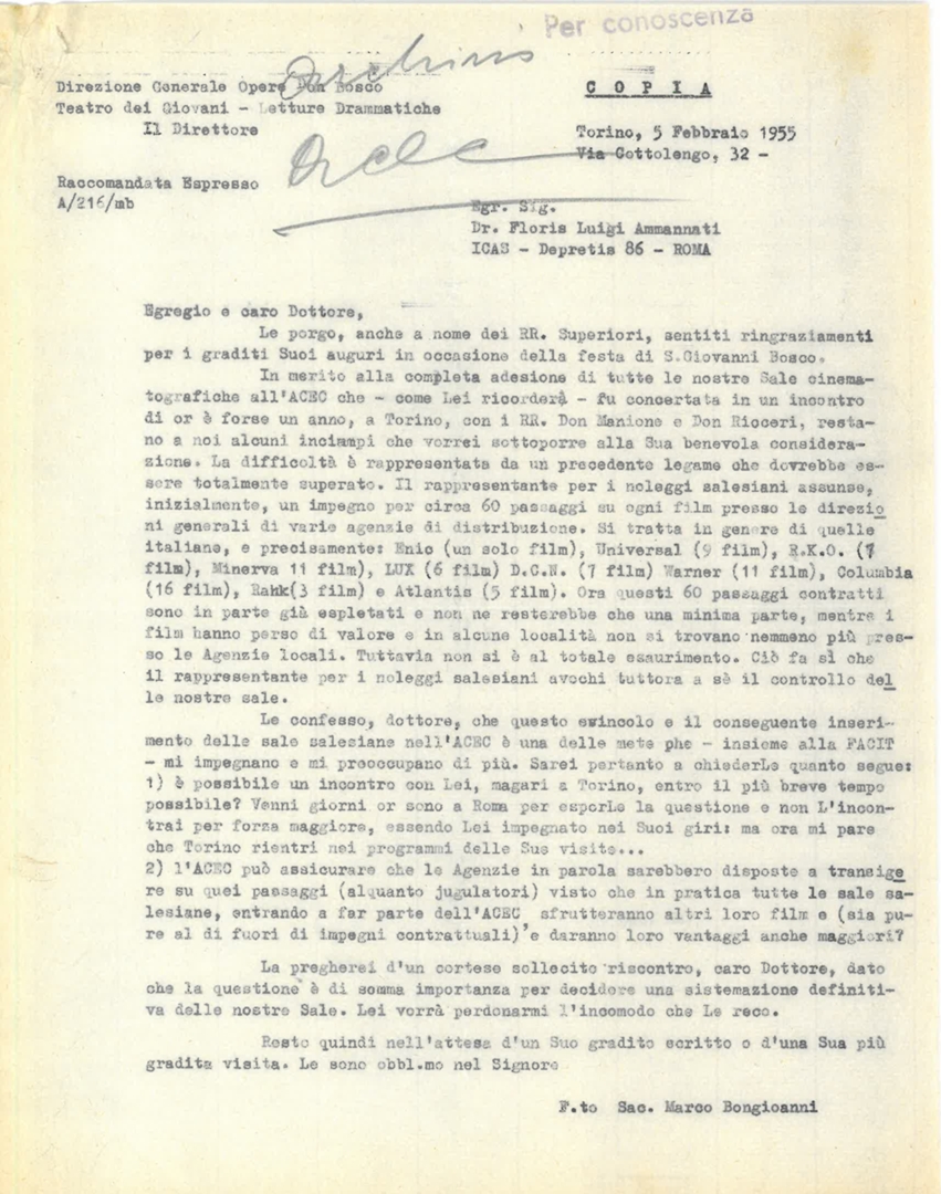 Marco Bongioanni comunica a Floris Luigi Ammannati le difficoltà per una completa adesione di tutte le sale cinematografiche salesiane all'ACEC. Raccomandata espresso dattiloscritta