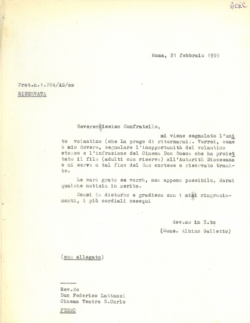 Lettera di mons. Albino Galletto, consulente ecclesiastico dell'Ente dello spettacolo, a don Federico Lattanzi, gestore del cinema teatro San Carlo di Fermo