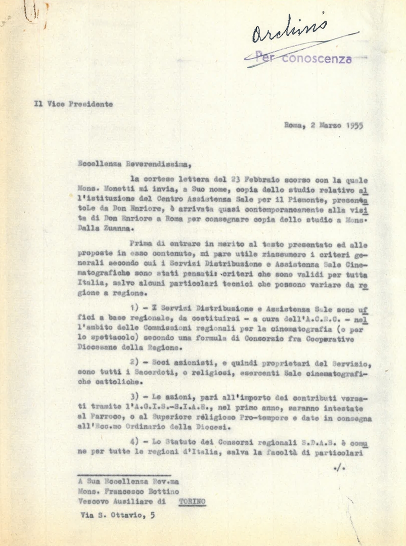 Floris Luigi Ammannati scrive a Francesco Bottino in merito allo studio per l'istituzione di in servizio assistenza sale cinematografiche in Piemonte. Dattiloscritto