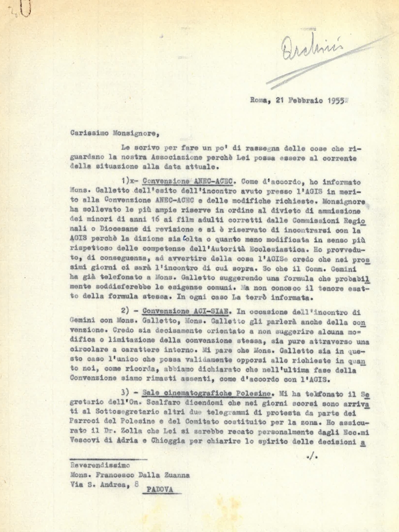 Lettera di Floris Luigi Ammannati, vice presidente dell'ACEC, a mons. Francesco Dalla Zuanna, presidente dell'ACEC