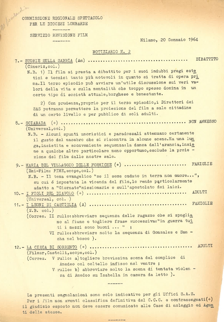 Commissione regionale spettacolo per le diocesi lombarde. Servizio revisione film, Notiziario n. 2