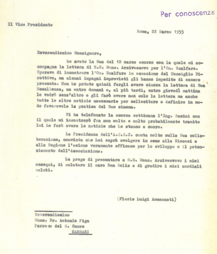 Lettera di Floris Luigi Ammannati, vice presidente dell'ACEC, a mons. Antonio Piga, delegato diocesano a Sassari e parroco del S. Cuore di Sassari