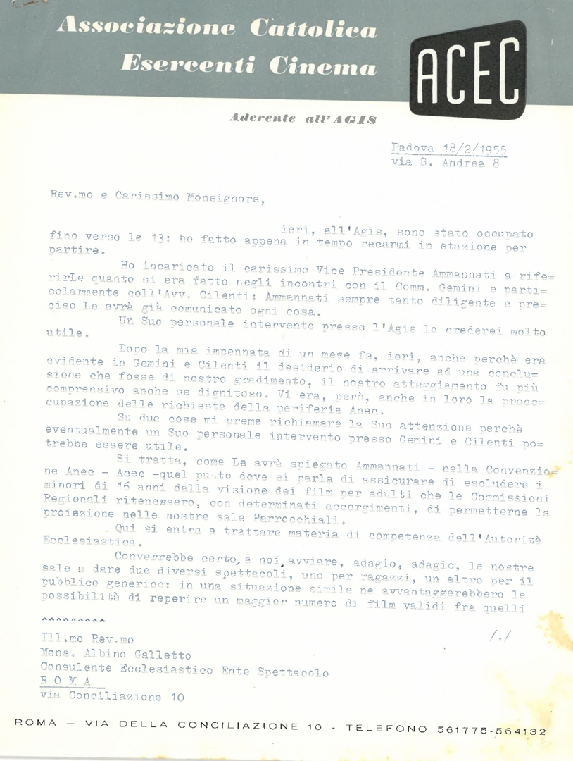 Lettera di mons. Francesco Dalla Zuanna, presidente dell'ACEC, a mons. Albino Galletto, consulente ecclesiastico dell'Ente dello spettacolo