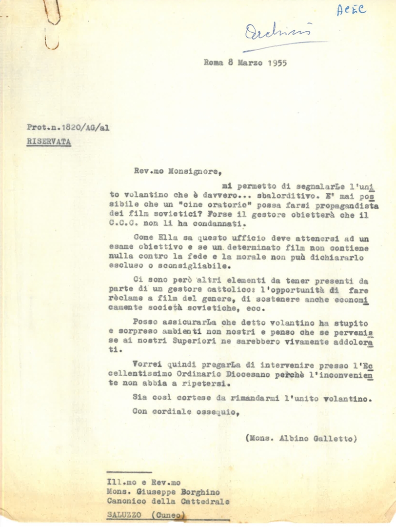 Mons. Albino Galletto segnala a mons. Giuseppe Borghino la riprovevole condotta del cine-oratorio, in particolare a proposito dell'utilizzo di un volantino pubblicitario di film sovietici. Dattiloscritto