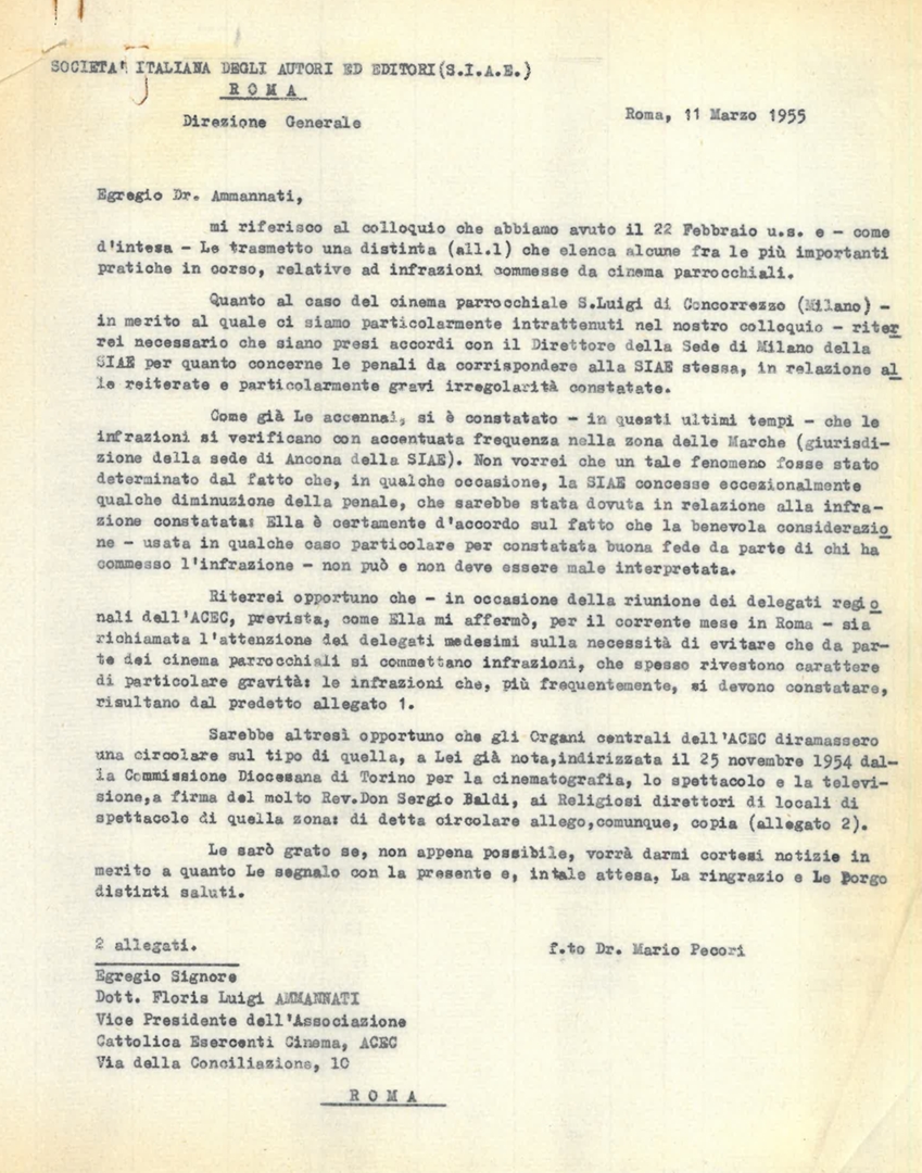 Lettera di Mario Pecori, direttore della Società Italiana degli Autori ed Editori - SIAE, a Floris Luigi Ammannati, vice presidente dell'ACEC