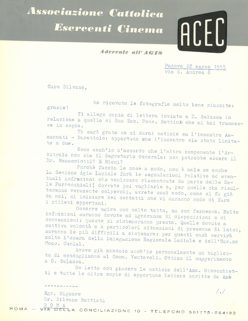 Lettera di mons. Francesco Dalla Zuanna, presidente dell'ACEC, a Silvano Battisti, segretario generale dell'ACEC