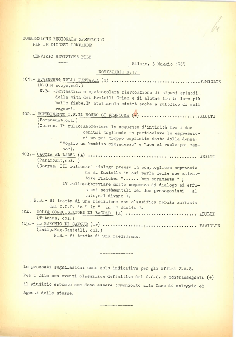 Commissione regionale spettacolo per le diocesi lombarde. Servizio revisione film, Notiziario n. 17