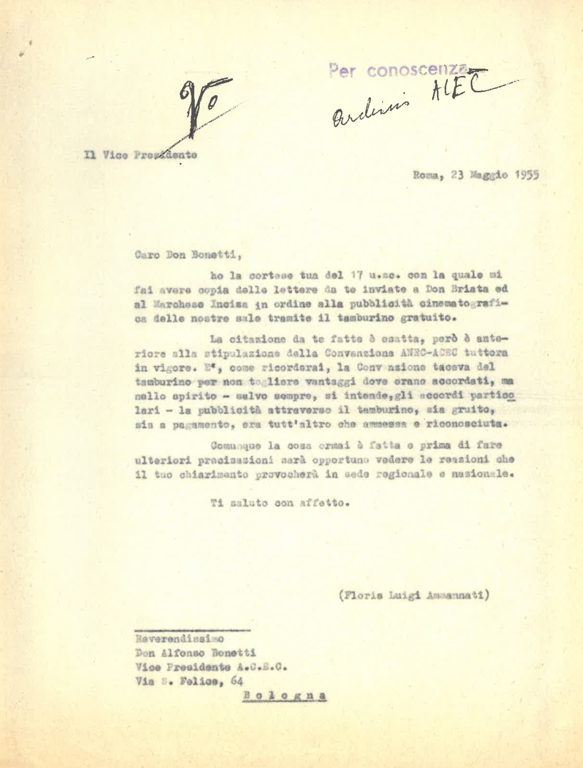 Floris Luigi Ammannati risponde a don Alfonso Bonetti in merito alla pubblicitĂ cinematografica delle sale cattoliche tramite il tamburino gratuito, che ha sollevato problemi nei rapporti con gli enti del settore dello spettacolo. Dattiloscritto