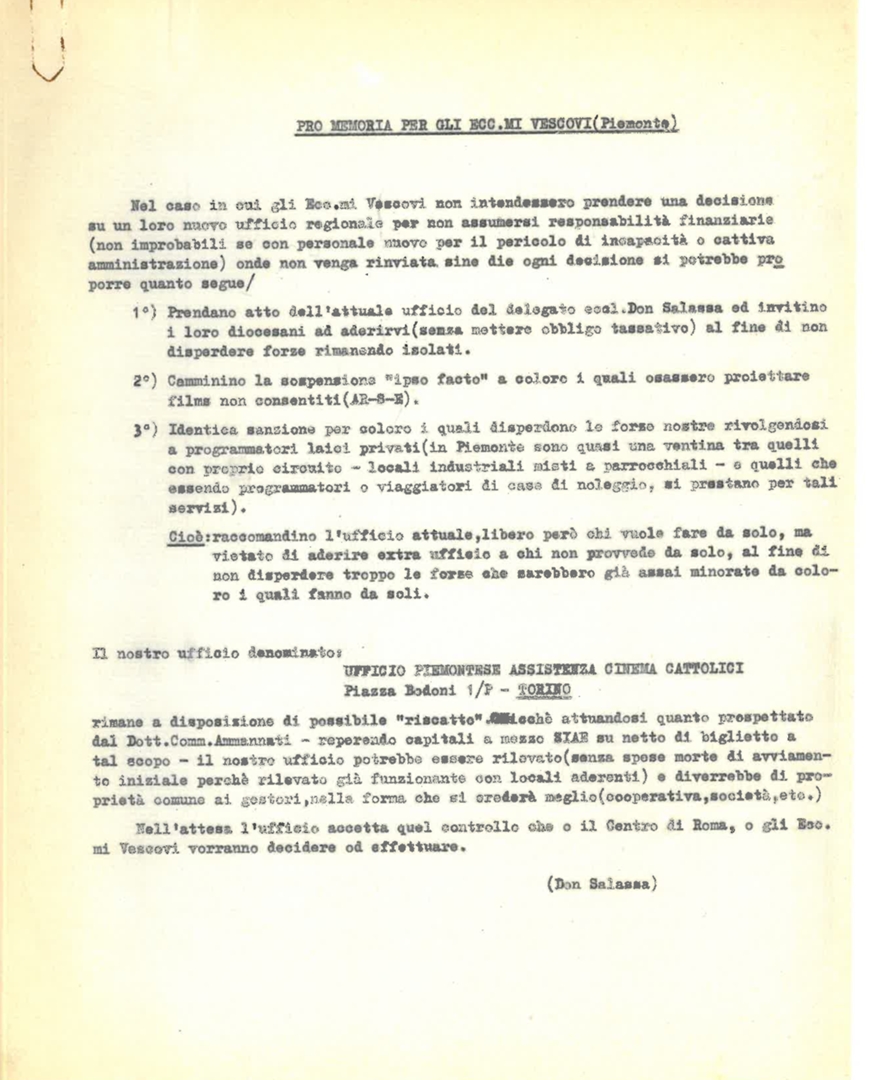 A proposito della disciplina cinematografica delle sale parrocchiali, don Angelo Salassa invia ai vescovi del Piemonte una sua proposta e un documento redatto a cura della Commissione diocesana di vigilanza. Dattiloscritto