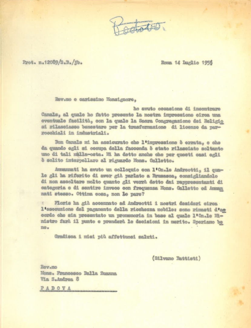Silvano Battisti scrive a mons. Francesco Dalla Zuanna in merito alla trasformazione di licenze cinematografiche da parrocchiali a industriali. Dattiloscritto
