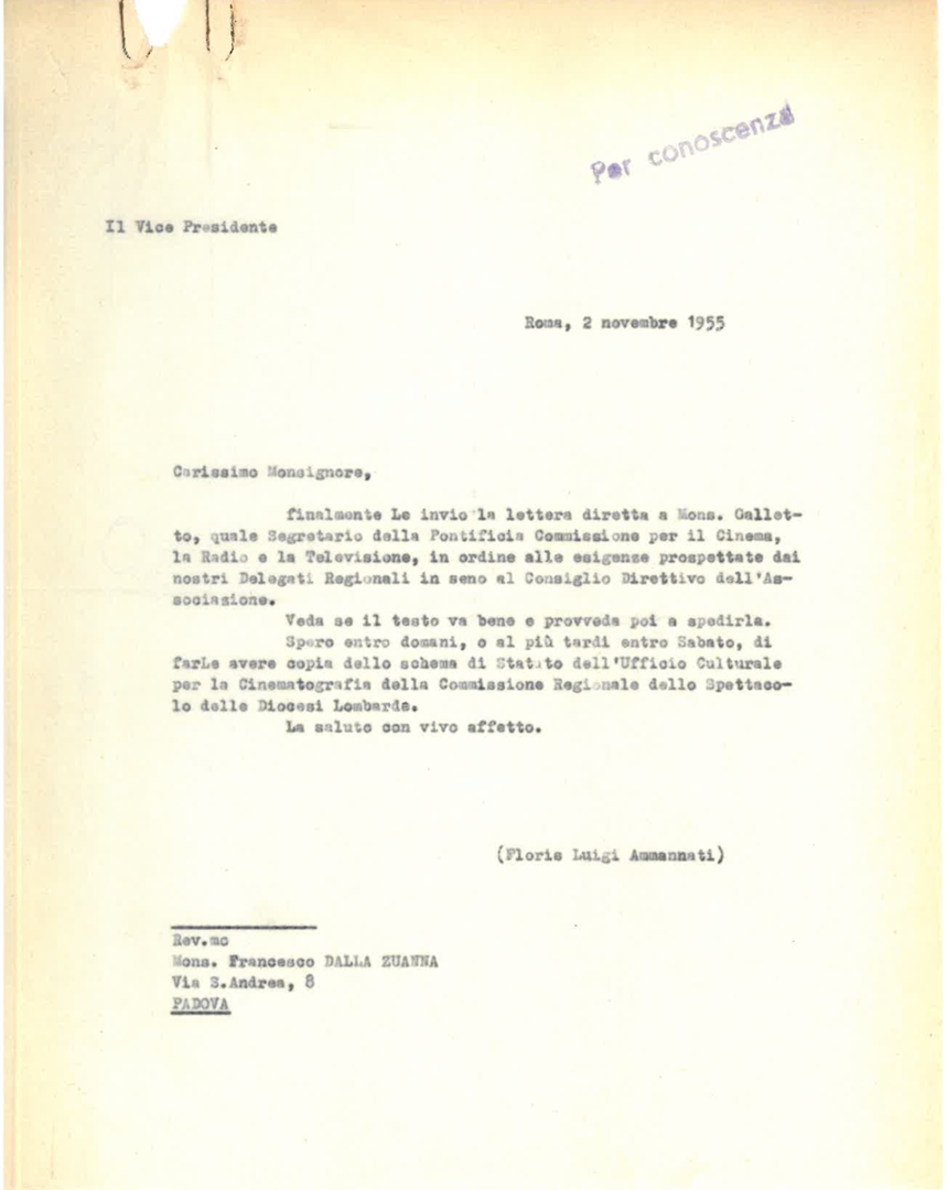 Floris Luigi Ammannati invia a mons. Francesco Dalla Zuanna la lettera diretta ad Albino Galletto, segretario della Pontificia commissione per il cinema, la radio e la televisione, in merito alle esigenze espresse dai delegati regionali dell'ACEC. Dattiloscritto