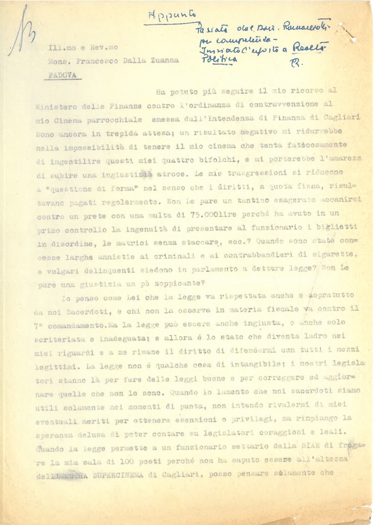 Don Antonio Tuveri scrive a mons. Francesco Dalla Zuanna in merito al ricorso contro l'ordinanza di contravvenzione emessa dall'Intendenza di finanza per il cinema parrocchiale di Cagliari gestito dallo stesso Tuveri. Dattiloscritto