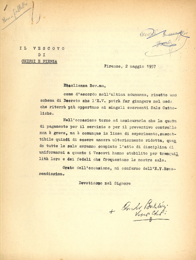 Disposizioni per il SAS. Con lettera di trasmissione di Carlo Baldini, vescovo di Chiusi e Pienza, a mons. Albino Galletto, consulente ecclesiastico dell'Ente dello spettacolo. Dattiloscritto